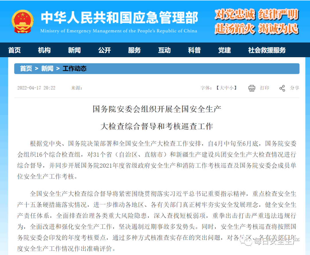根據(jù)黨中央、國務(wù)院決策部署和全國安全生產(chǎn)大檢查工作安排,自4月中旬至6月底,國務(wù)院安委會組織16個(gè)綜合檢查組,對31個(gè)。ㄗ灾螀^(qū)、直轄市)和新疆生產(chǎn)建設(shè)兵團(tuán)安全生產(chǎn)大檢查情況進(jìn)行綜合督導(dǎo),并同步開展國務(wù)院2021年度省級政府安全生產(chǎn)和消防工作考核巡查及國務(wù)院安委會成員單位安全生產(chǎn)工作考核。重點(diǎn)查十五條硬措施!